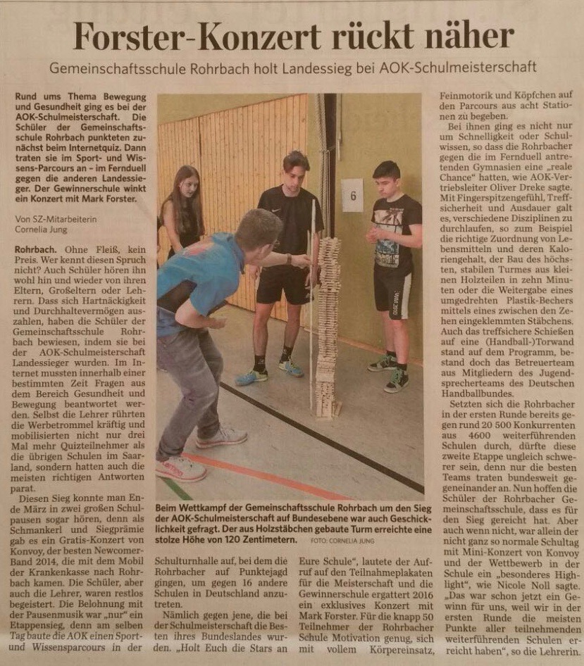 Am letzten Schultag vor den Ferien fand die AOK-Schulmeisterschaft an unserer Schule statt. Dazu kam die AOK mit vielen jungen Helfern aus dem deutschen Handballbund. Sie stellten einen Wissens-Geschicklichkeit-Sportparcour auf, bei dem 40 Schülerinnen und Schüler möglichst viele Punkte sammeln mussten. Denn mit diesem Parcour tourt die AOK durch ganz Deutschland und besucht die 17 Schulen, die das AOK-Quiz im Vorentscheid gewonnen hatten. Der Gewinn bei diesem Parcour ist ein Konzert von Mark Forster.