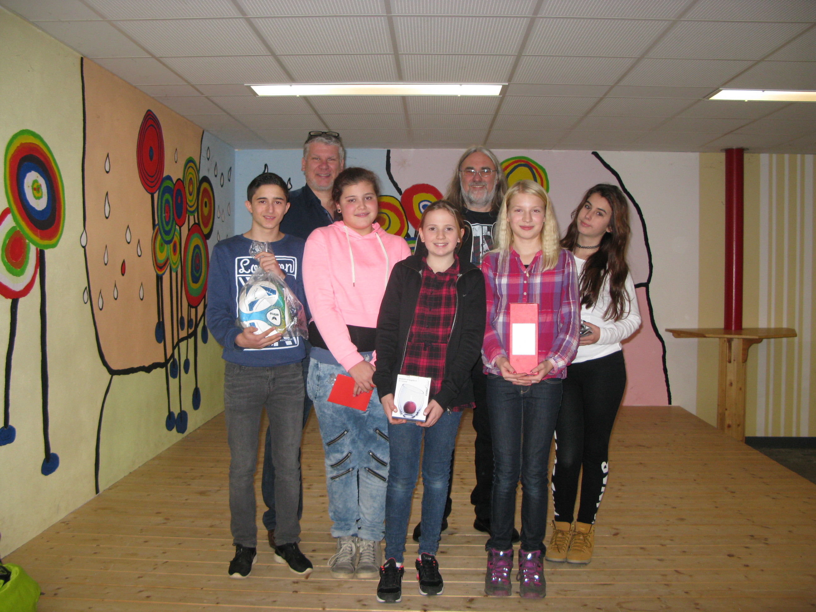(von links nach rechts): Alfredo De Luca (Schulsieger Förderklasse), stv. Schulleiter Friedrich Kollmar, Cathleen Schneider (Schulsiegerin), Chiara Berrang (3. Platz), Juror Arno Ilgemann, Lena Winkle (2. Platz) und Chiara Greß (4. Platz).