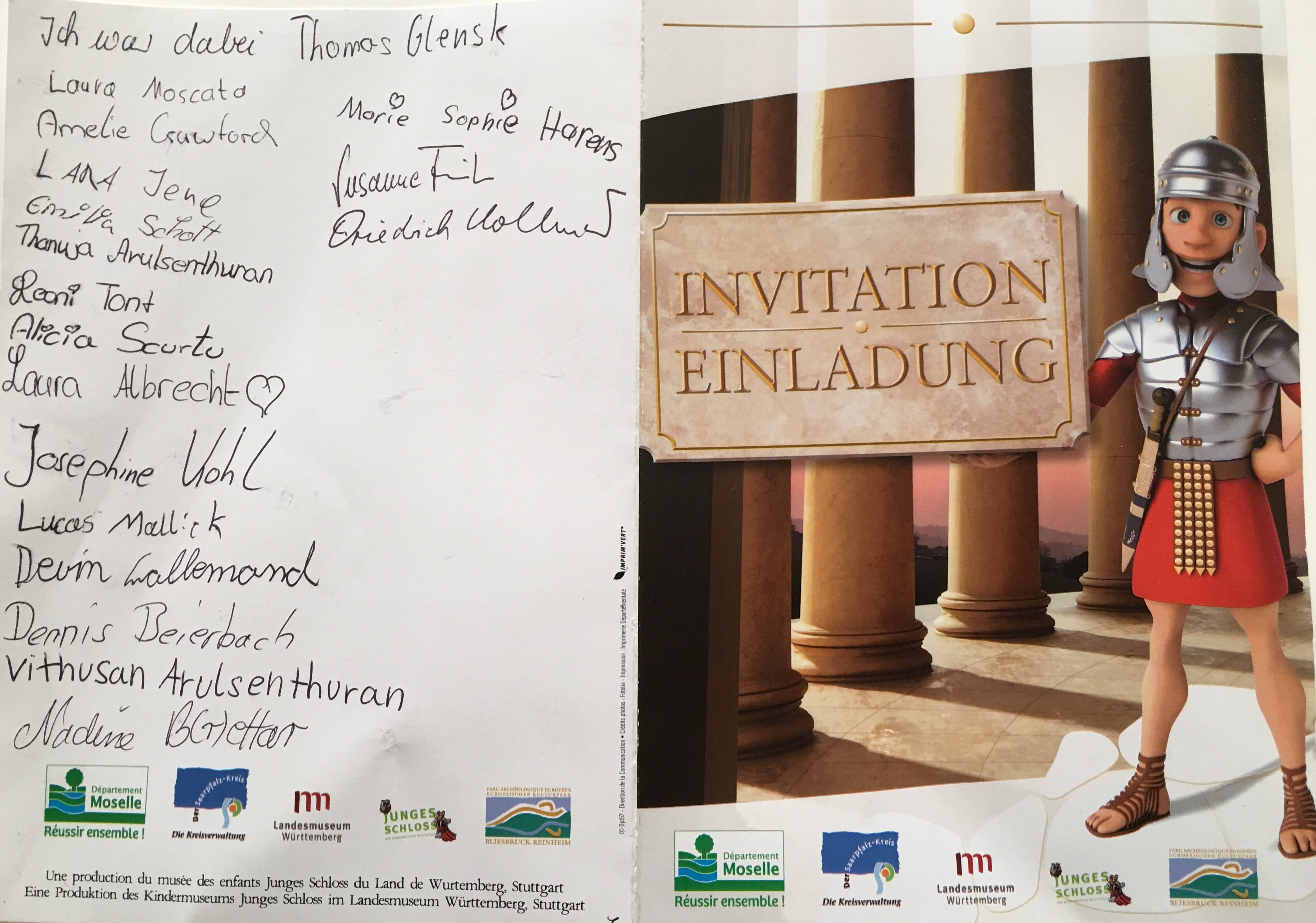 13 Schülerinnen und Schüler der Klasse 5.3 sowie 3 Schülerinnen der Klasse 6.3 dürfen im Rahmen einer feierlichen Eröffnung am 16.03.2017 Ehrengäste durch die eigentlich für Kinder gedachte Mitmachausstellung Römische Baustelle! Eine Stadt entsteht führen und den Erwachsenen zeigen, wie die Römer Straßen pflasterten, Rundbogen aus Keilsteinen bauten, Dächer deckten, Brunnen bauten, Mosaiken legen und vieles mehr. Als Spezialisten demonstrieren sie das Prinzip der römischen Fußbodenheizung, sie wissen worauf beim Bau eines Aquädukts zu achten ist, welche aus Eisen gefertigten Werkzeuge römische Steinmetze, Schmiede und Zimmerleute benutzten und welche wichtigen Gebäude in römischen Städten zu finden waren. Gemeinsam mit einem Team französischer Schüler werden sie das ebenfalls zweisprachige Publikum die römische Baustelle live erleben lassen. In Be